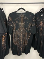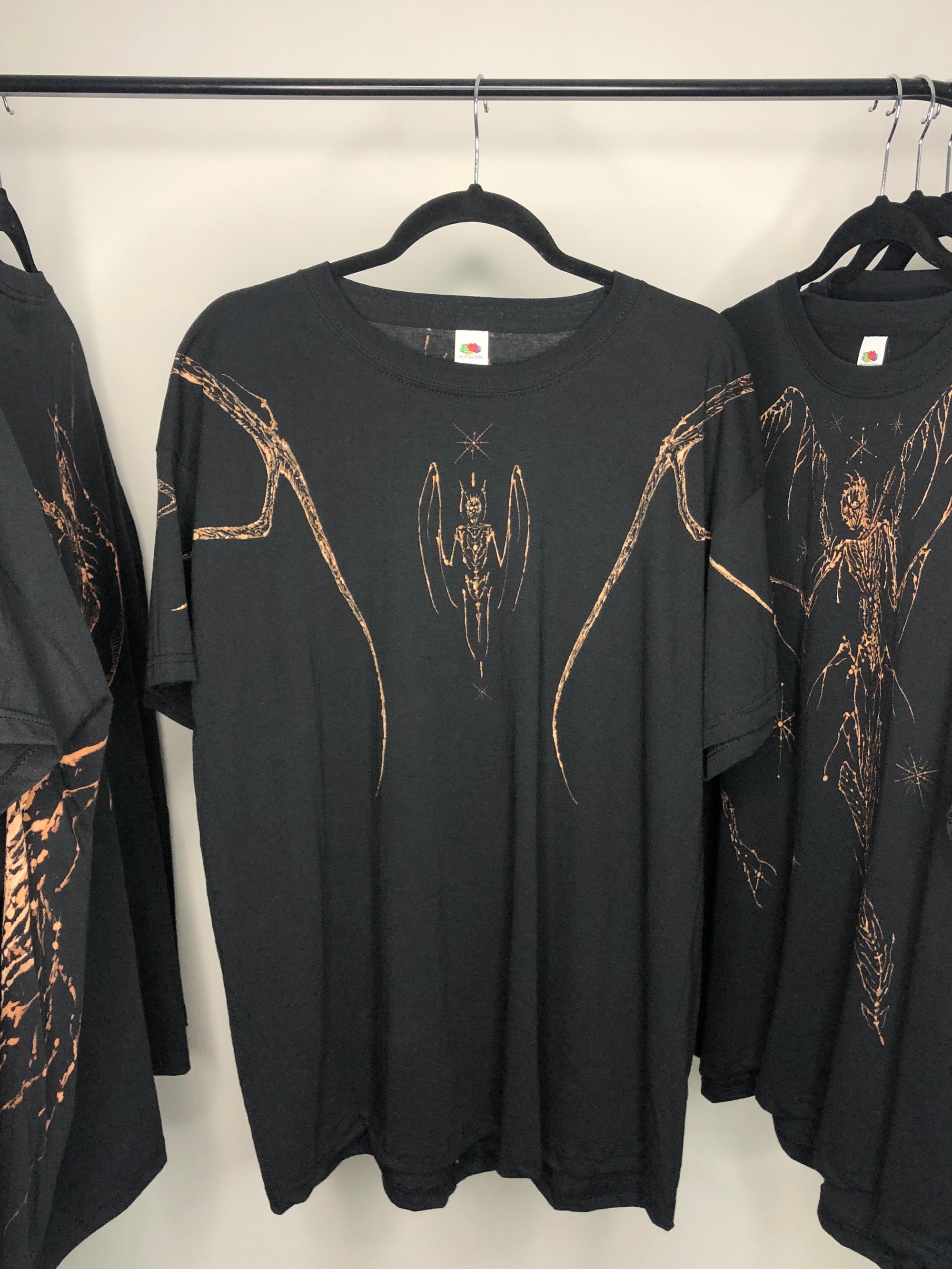 Hand painted bleach on Fruit of the Loom XL Black Tee.